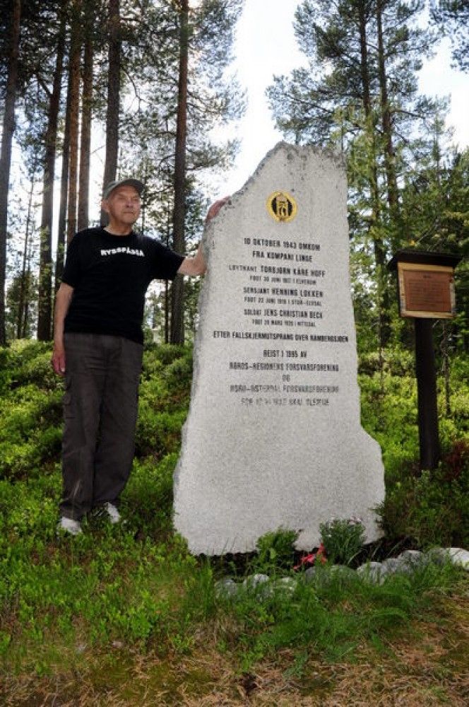 Sent på kvelden den 10. oktober 1943 druknet tre fallskjermjegere fra Kompani Linge i Rambergsjøen utenfor Røros. Leif Sæther (84) sørger for at det alltid står friske blomster ved minnestøtta.