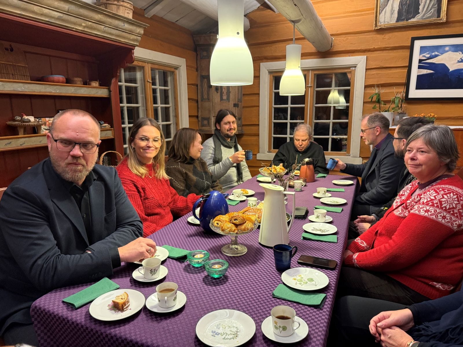 Besøket på Amperhaugen ble avsluttet med kaffe inne i peisestua hos Mette og Jo. Under bordsete holdt Håkon Edvard Nesset og Jo kåseri om kunstneren Harald Sohlberg og hans mesterverk Vinternatt i fjeldene.