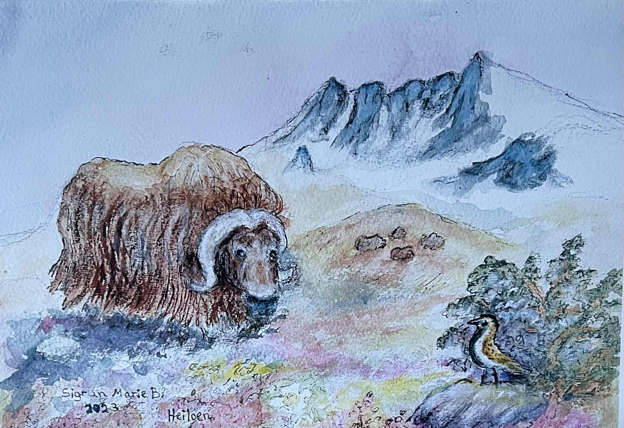 Sigrun Barstad, født i 1946, flyttet for noen år siden til Koppang, der hun bor sammen med hundene sine på Trønnes. Hun er hobbykunstner med utdanning fra Einar Granums Kunstakademi, og har tidligere illustrert bøker, stilt ut oljemalerier og arbeidet med plantefargede billedvever. Natur og dyr er hennes viktigste inspirasjonskilder, og motivene springer ofte ut fra fjellturer og møter med dyreliv. Til vinterutstillingen viser Sigrun en akvarell med blandingsteknikk, malt etter en tur på Dovrefjell der hun for første gang møtte både heiloen og moskusoksen.