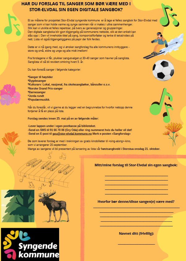 Prosjekt Syngende kommune v/sangutvalget ønsker innspill til hvilke sanger som bør være med i kommunens egen sangbok! Flyers med nødvendig info er lagt ut på Joker Atnbrua og på Matkroken Atna. Vi ser fram til mange gode forslag innen 25. mai!