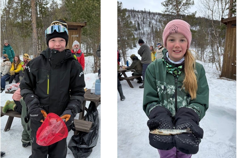 Sinus Langseth fikk premie for den minste fisken i barneklassen, men ikke totalt. Den var det Marte Henriksen som fikk for en på 14,5 cm, en halv cm kortere en Sinus sin. De fleste som pilket fikk verken napp eller fisk, men Liv Taeymans hadde fiskelykke og kunne vise fram en fin liten ørret.