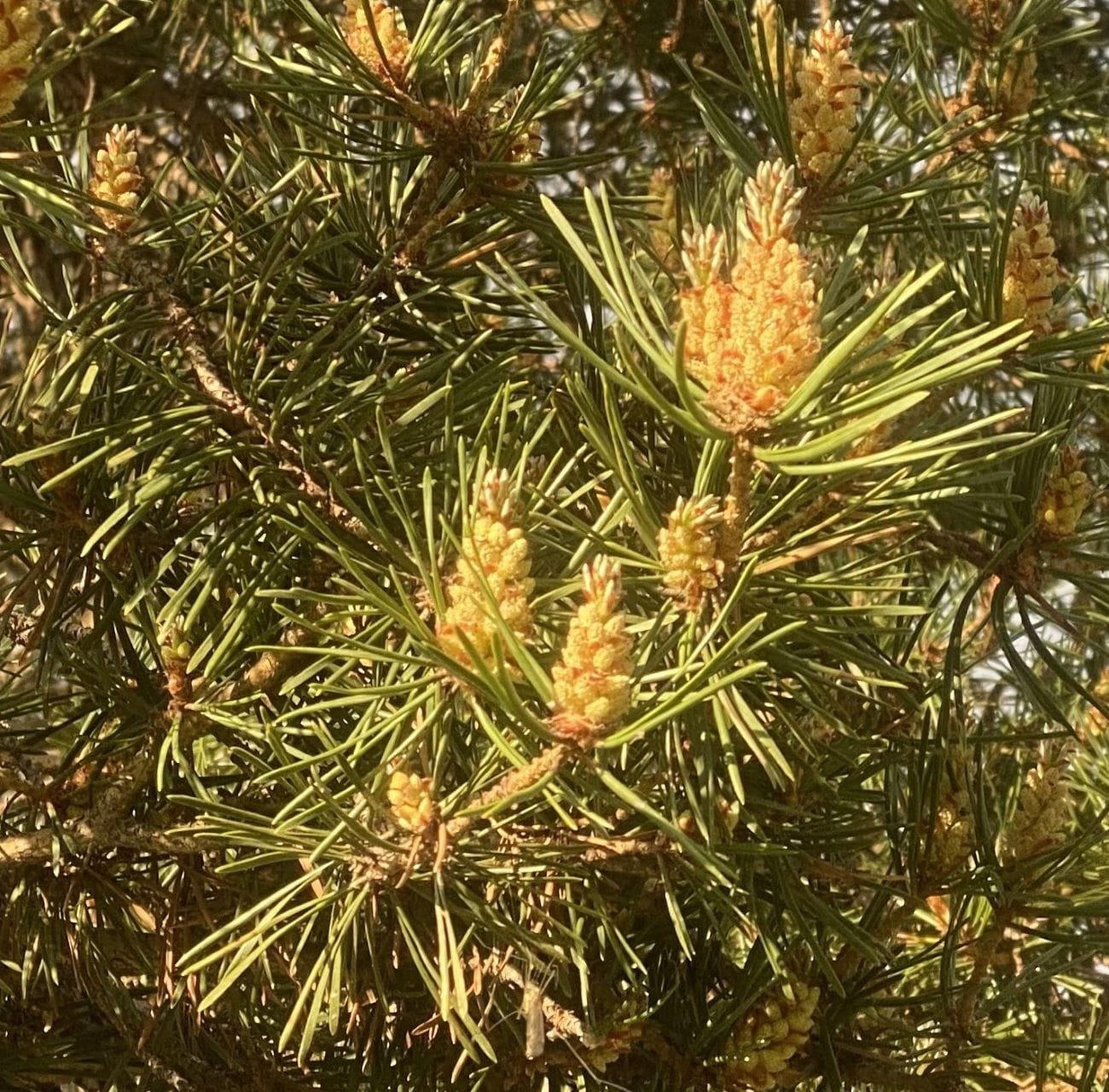 Furua blomstrer litt senere enn grana, men sprer også mengder med gult pollen.