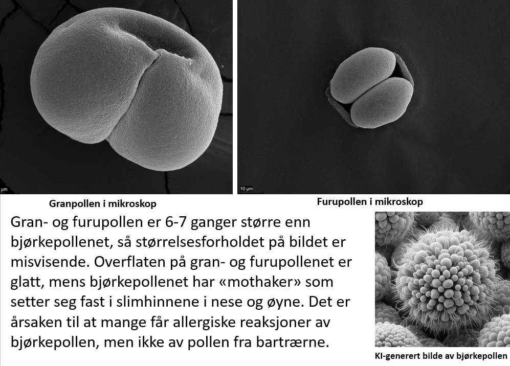 Når det gjelder pollenallergi er gran og furu sjelden et problem fordi pollenkornene er store og glatte og ikke irriterer slimhinnene slik som bjørkepollenet.