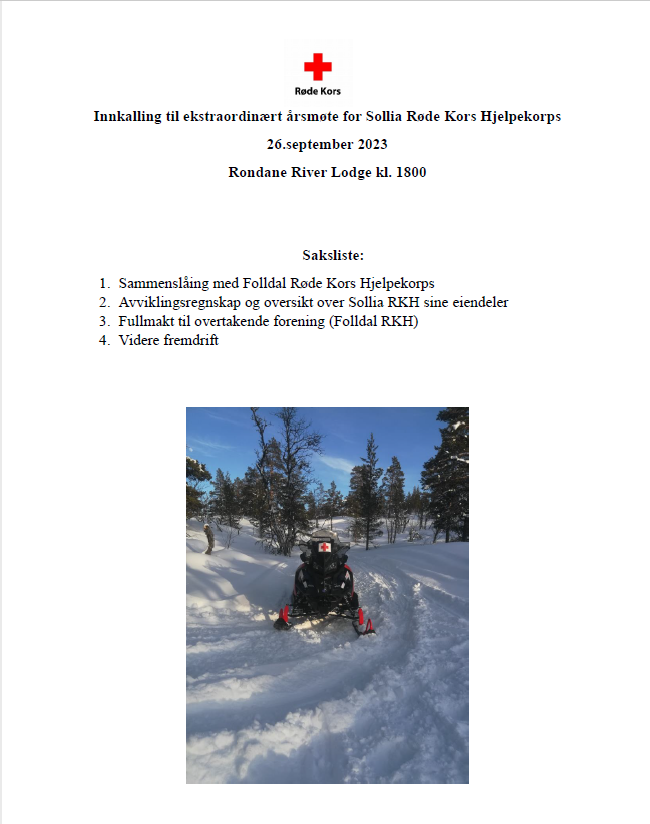Ekstraordinært årsmøte for Sollia Røde Kors tirsdag 26. september