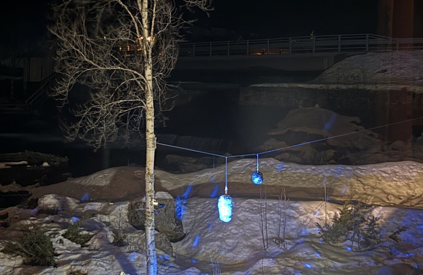 Utstillingen inne er tatt ned, men lysinstallasjonen vil fortsatt skape magi ved fossen utover i mørketida.