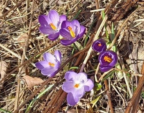 Blåveisen vokser ikke vilt i Sollia, men mange har denne vakre vårblomsten i hagen sin. Nå har den begynt å titte fram, og i likhet med de andre vårtegnene, er den veldig tidlig ute i år, i hvert fall fjorten dager før det som har vært normalt. Det samme gjelder krokusen som blomstrer i Prestgarden nå. - I dag er det også sett rødstrupe og kjernebiter i Mostua.