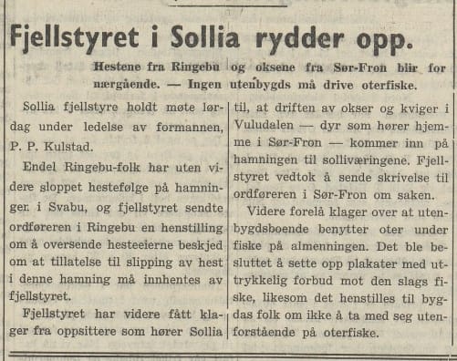 Det ser ut til at fjellstyret hadde en slags rolle som klagenemd på den tiden. Her er det sendt inn klage både på ulovlig beiting og oterfiske, og fjellstyret har absolutt tatt klagene på alvor. Brev om beitinga ble sendt til ordførerne i Ringebu og Sør-Fron og det ble vedtatt å sette opp strenge plakater om at oterfiske var forbudt for utenbygdsboende. De skulle heller ikke få være med i båten til solliværingene når de var ute på lovlig fisking med oter.