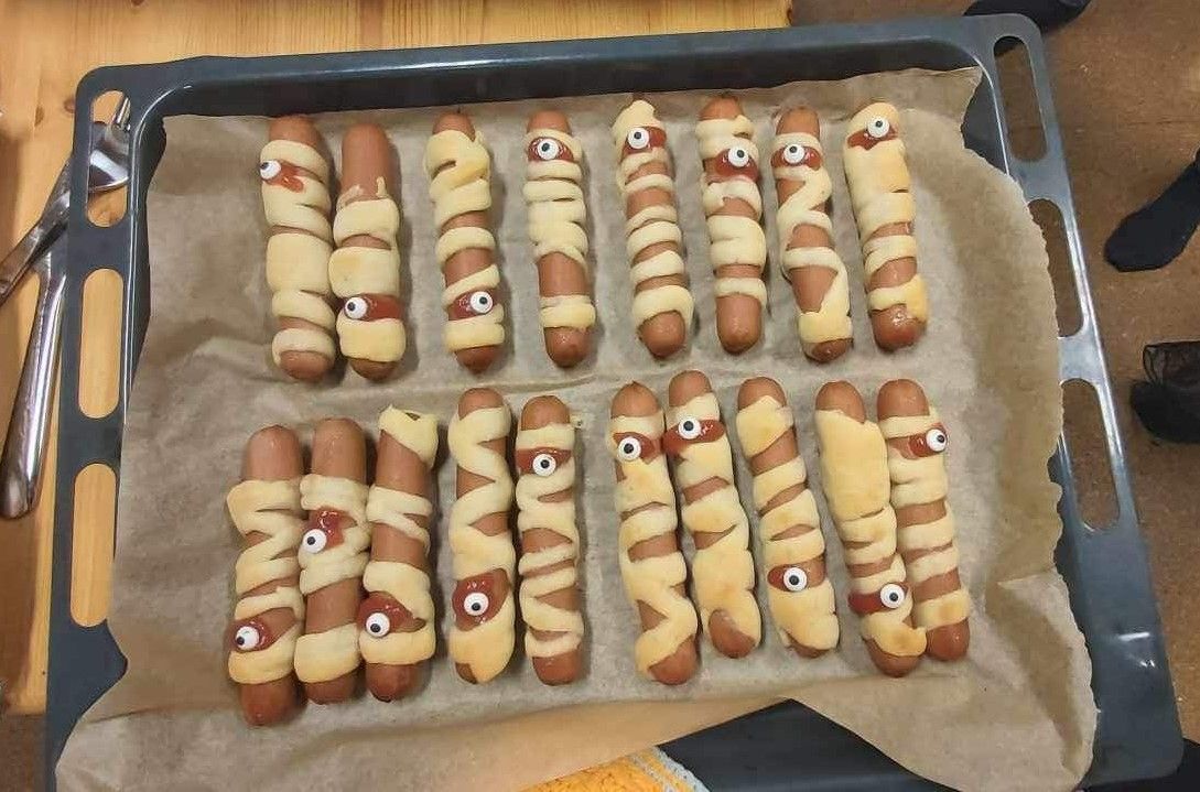 Menyen besto av mumiepølser og gelé med blod- eller slimsaus.