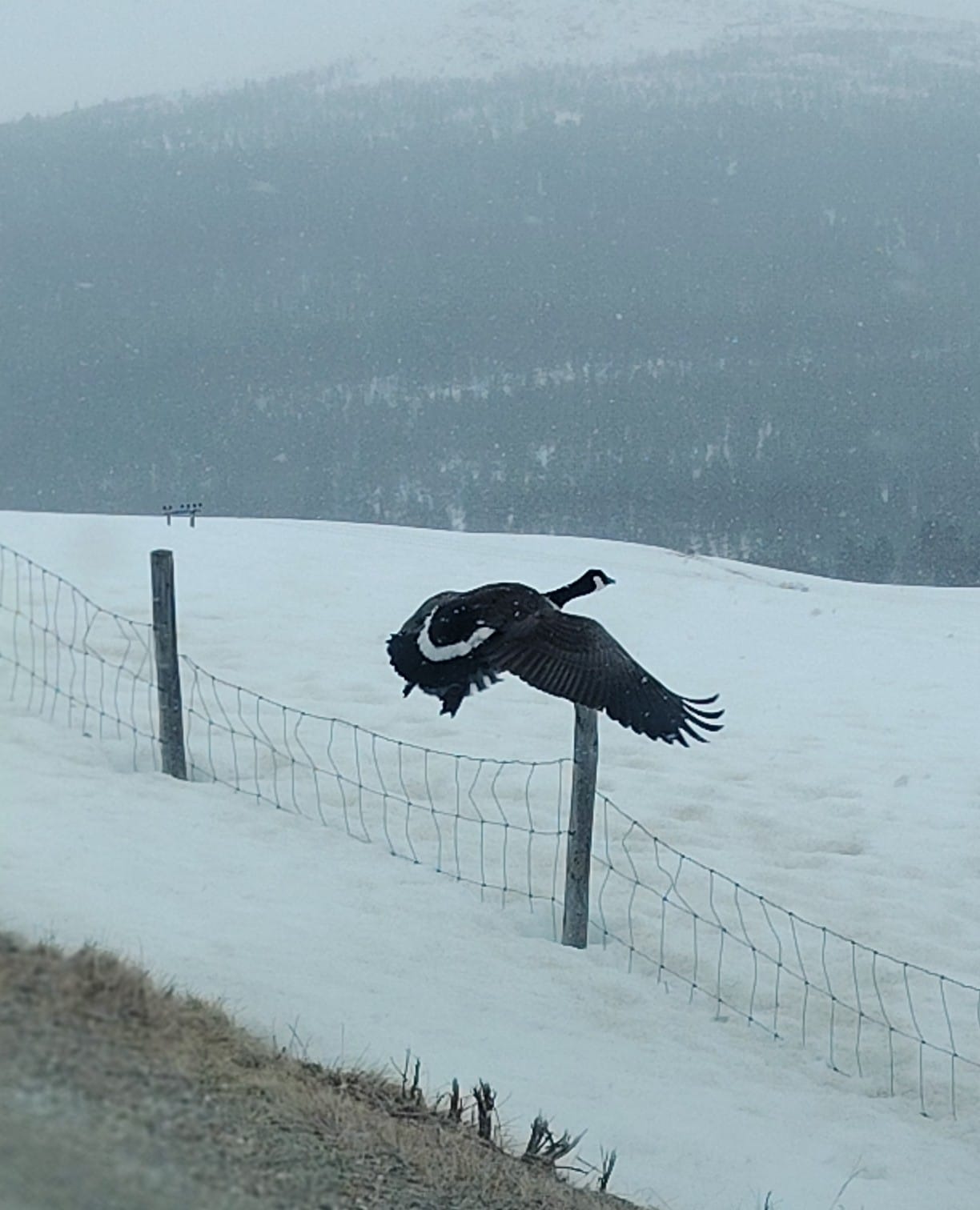 Dette bildet ble tatt her ved Atnbrua nokså nylig. Dette er ei kanadagås og sollia.net mistenker at den muligens har lokalt opphav og at den ikke er på et lengre trekk, men uansett bør nok hullene i veien fylles med noe annet enn kanadagås.