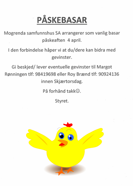 Det blir påskemoro og basar på Mogrenda på påskeaften i år også. Vil du bidra med gevinster til basaren, så ta kontakt. Det vil det bli satt stor pris på!