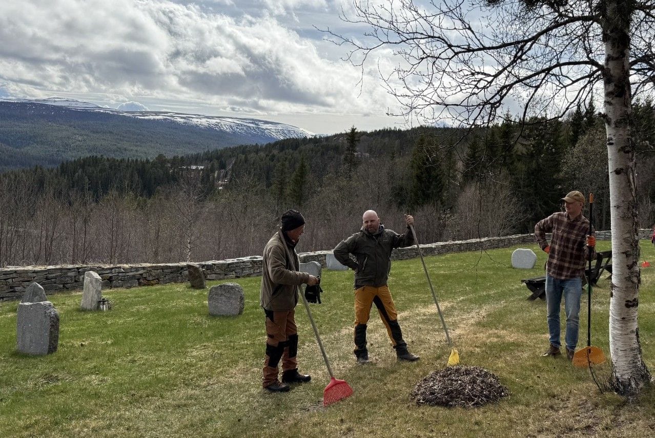 Rundt tretti stykker møtte opp på kirkegårdsdugnaden på fredag. I år var det mindre løv enn vanlig så rakinga gikk unna i rekordfart. Da ble det god tid til å prate sammen uten å forsømme arbeidet og det fine været bidro også til at det bare var blide fjes å se. Nå er kirkegården gjort fin og presentabel til 17. mai.