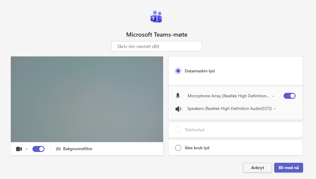 For å følge møtet på mobilen må du ha installert Teams-appen, men på PC trenger du ikke det. Du velger "Fortsett i denne nettleseren" og får opp dette bildet:
