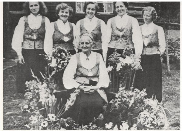 — Laget vårt ble stiftet i 1935. Jeg var den første formann, og min «regjeringstid» varte i 11 år. Da dompet jeg til nestformann. Det er rart å tenke på utviklingen i et menneskeliv. Jeg begynte i Sollia å lære småjentene å monke — senere ble det håndarbeid! Jeg unner husmødrene alt godt. Før var dørstokkene sa altfor høye, billedmessig sett. Husmødrene kom aldri over «dørstokken heme». Nå er det mer lek i arbeidet — og snart ingen dørstokker lenger!