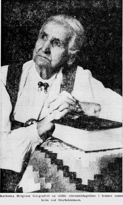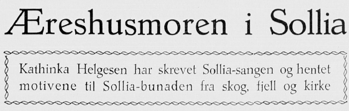 — Her er skogen. Løv og lyse lier — og gråstein! sier Kathinka Helgesen og stryker hengivent Sollia-bunaden, hennes egen komposisjon. Og så blusen — roen. Godt å ha med det som gir fred. Selvfølgelig er det fint med vind over blomstene — å, du skulle ha sett alle landets bunader jeg så i Oslo en gang! Et vakkert syn. Men ingen ga slik ro som Sollia-bunaden. Vet du forresten hvor jeg fant motivet til søljen? Bak kirken vår! Jeg så solen forsvant bak kirkespiret en kveld. Da steg motivet fram! Da så jeg ordene som ringer inn søljen: «Fager er Sollia, jeg vet ingen vakrere»....