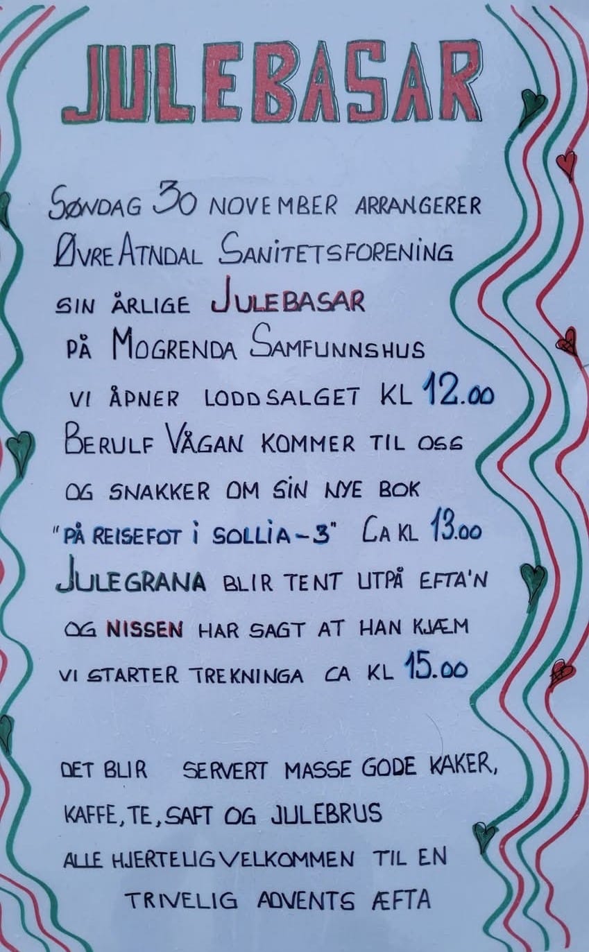 På søndag er det god gammeldags basar i regi av Øvre Atndal sanitetsforening på Mogrenda samfunnshus. Tradisjonen tro blir det tenning av julegrana, besøk av nissen og gratis kaker og kaffe. Dessuten kommer Berulf Vaagan for å snakke om den siste boka si "På reisefot i Sollia -3".