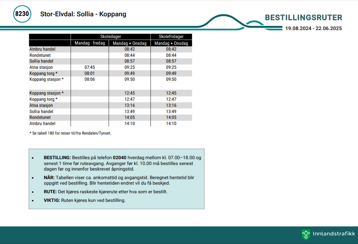 Vi har tidligere skrevet om dette, men tror det er på tide med en reprise: - Mange vet ikke at vi har et kollektivtilbud i Sollia, men det har vi, og det heter "bestillingsdrosje". Den går hver mandag og onsdag tur-retur Atnbrua-Koppang og koster det samme som en bussbillett. Alle reisende kan benytte seg av denne skyssen, men den må bestilles dagen før på telefon 02040.