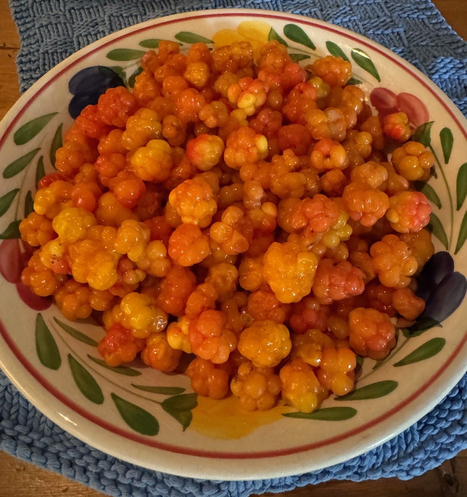 Som vi har skrevet før, det er lite von om å finne mye multer i år. Men ser du godt etter mellom bjørker og kjerr, er det mulig å finne nok til fersk multesoll. Men vi hører at høgt til fjells er det blomster som først har knept seg nå.