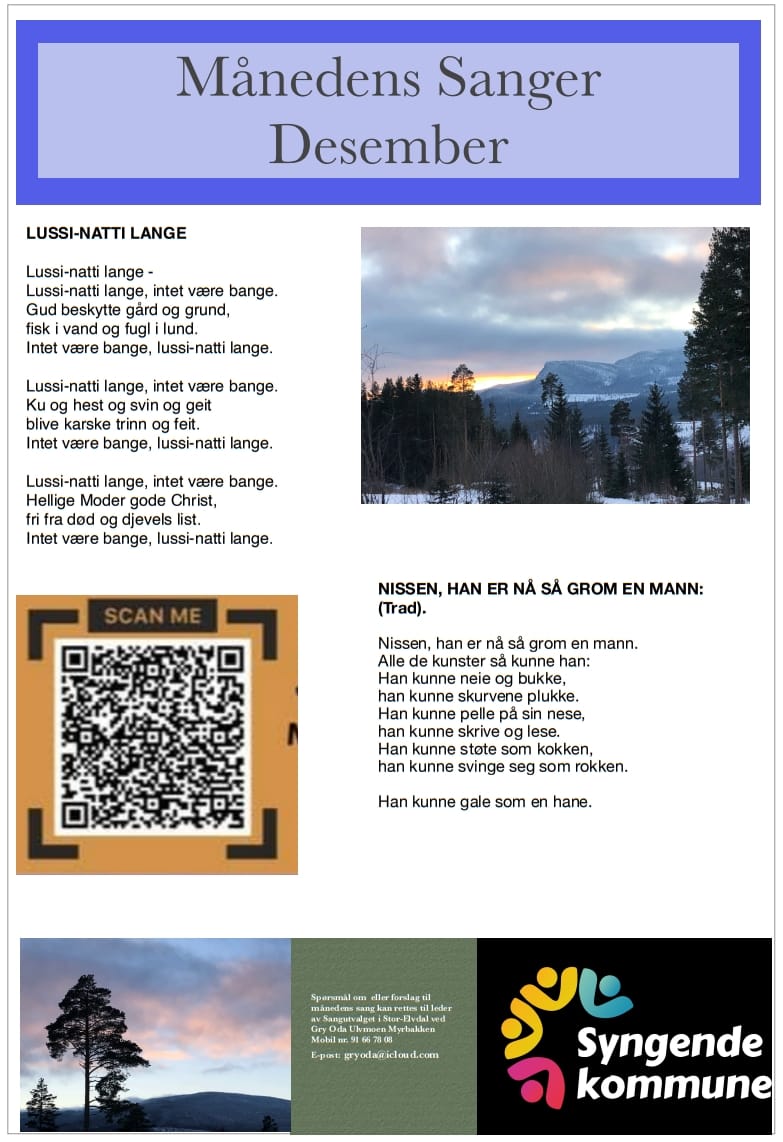 Sangutvalget i prosjektet "Syngende kommune" oppfordrer til økt sangglede i hverdagen, og som et bidrag velger de ut "månedens sang" hver måned. Gry Oda Ulvmoen har laget en fin plakat for desember med teksten til to sanger. Du kan høre sangene ved å skanne QR-koden på plakaten eller trykke på lydfilene nedenfor, og synge i vei!