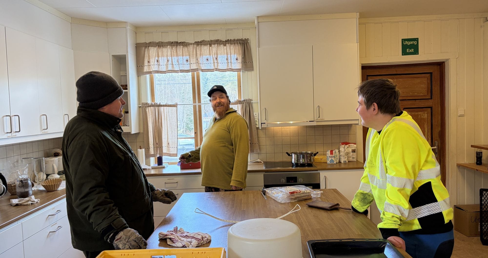 Det er nok å henge fingrene i på kjøkkenet også, men det er en viktig dugnadsjobb som gjøres her. Det trengs penger for å drifte samfunnshuset, og på skjærtorsdag ble det solgt kaker og kaffe for rundt 10.000 kr.