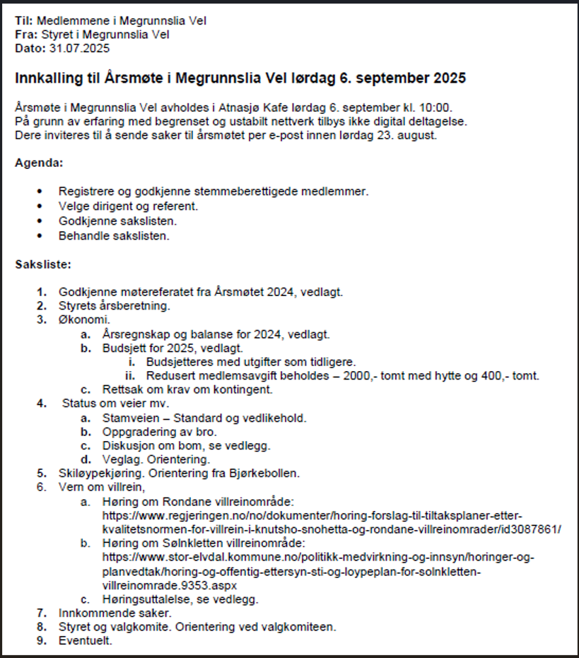 Megrunnslia Vel - Årsmøte på Atnasjø kafé lørdag 6. sep. kl.10