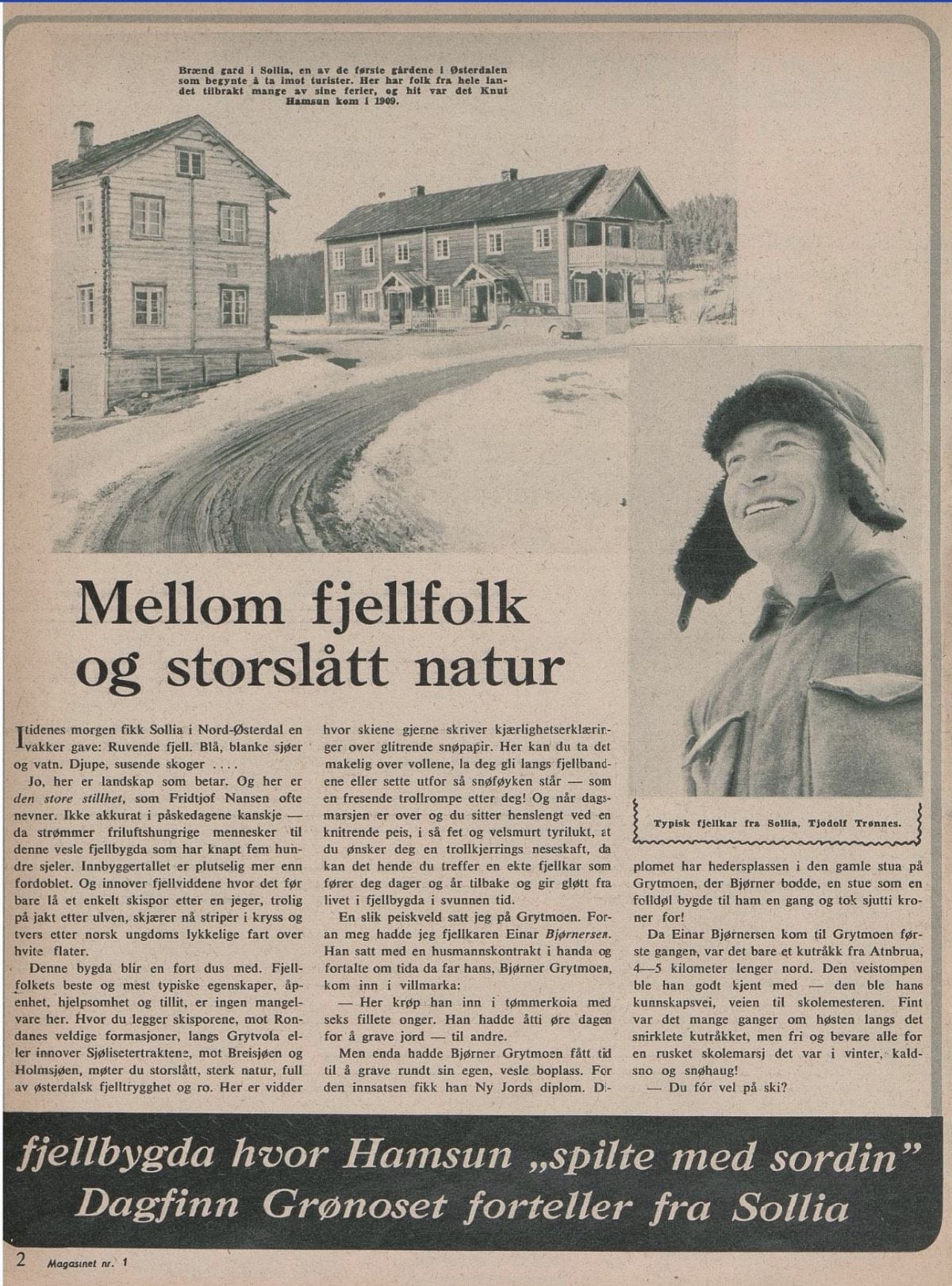 "Mellom fjellfolk og storslått natur" - det var overskriften på artikkelen om Sollia som forfatteren og journalisten Dagfinn Grønoset skrev i "Magasinet for Alle" i 1959. Her er det intervjuer med folk på Grytmoen, Nordre Brænd og Nesset og vi gjengir den første delen av artikkelen her. Resten av stoffet, som Leif Trønnes har sendt oss, publiseres senere.