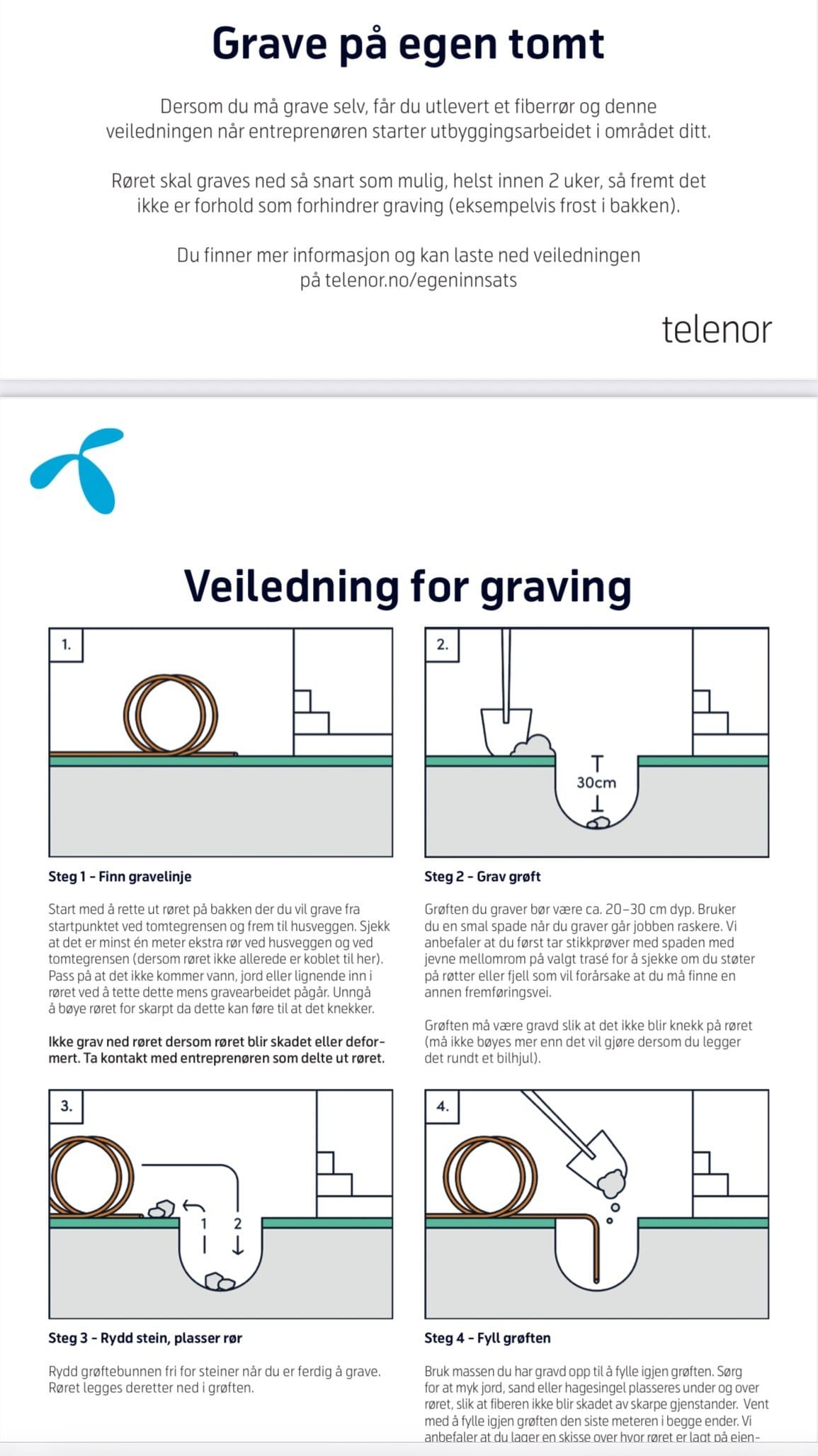 Den siste biten fra tomtegrensa til husveggen er det huseieren som har ansvaret for. Her kan du lese hvordan fiberrøret skal graves ned: