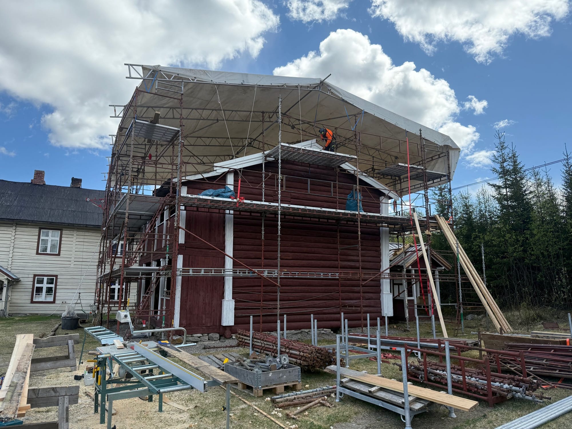 Det er Slettens Vøling AS ved Sveinung Sletten som leder dette arbeidet, sammen med en dyktig gjeng på fire personer. Prosjektet er planlagt å vare til litt ut i juni, og arbeidet blir gjort med materialer og metoder i tråd med tradisjonell byggeskikk.