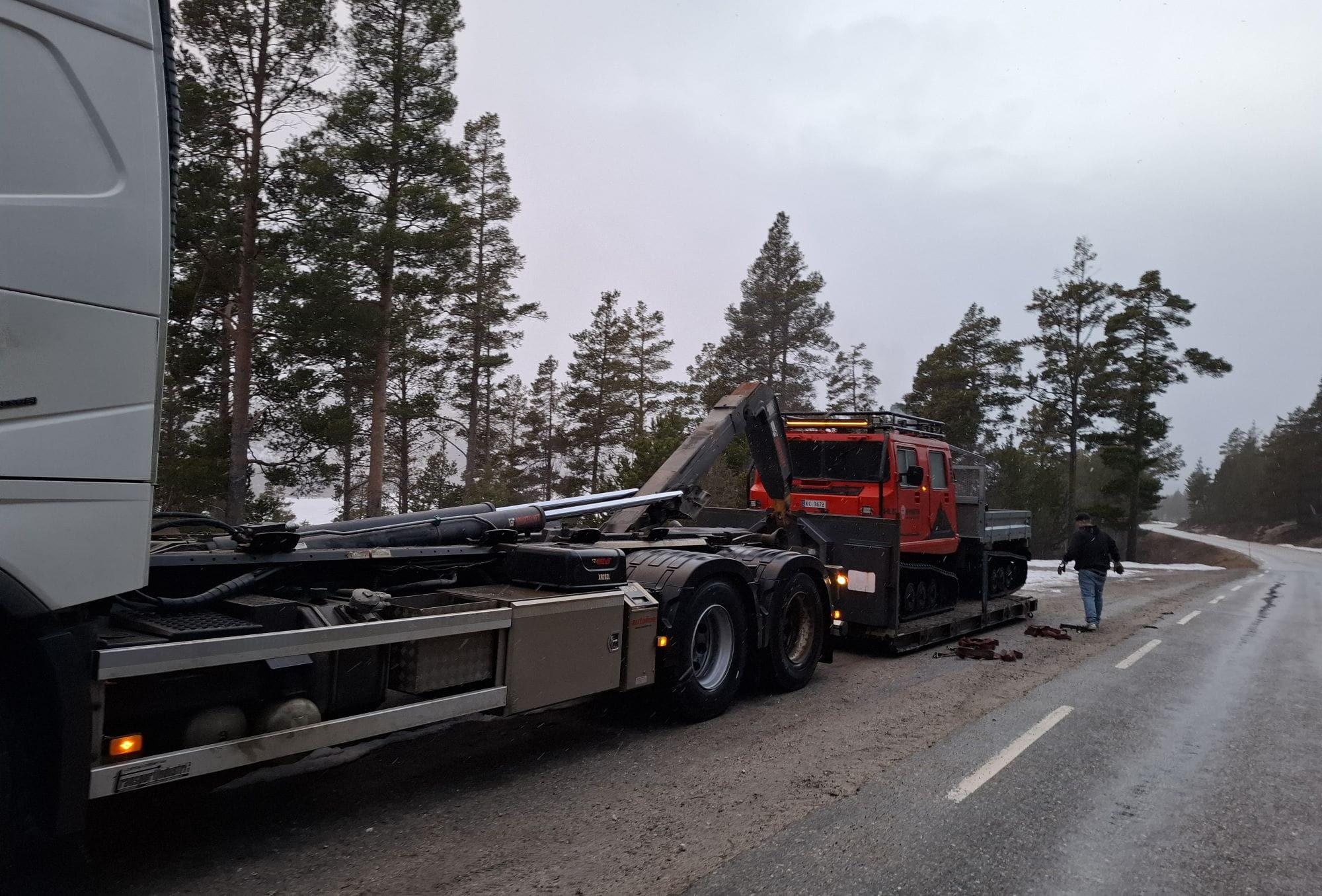Lian Bil og transport sørget for transporten. Denne maskinen har en salgsverdi på 650 000 kr og det sier også litt om hvor mye maskina "Brakar" som brant for oss også kostet. Mange har spurt oss, og vi kan forsikre alle sammen om at vi får ikke ei krone igjen på forsikringen. Brann, tyveri og hærverk var en egen forsikring vi ikke hadde. Så at folk støtter oss i spleis til ny maskin er til stor hjelp, vi takker alle for støtten!