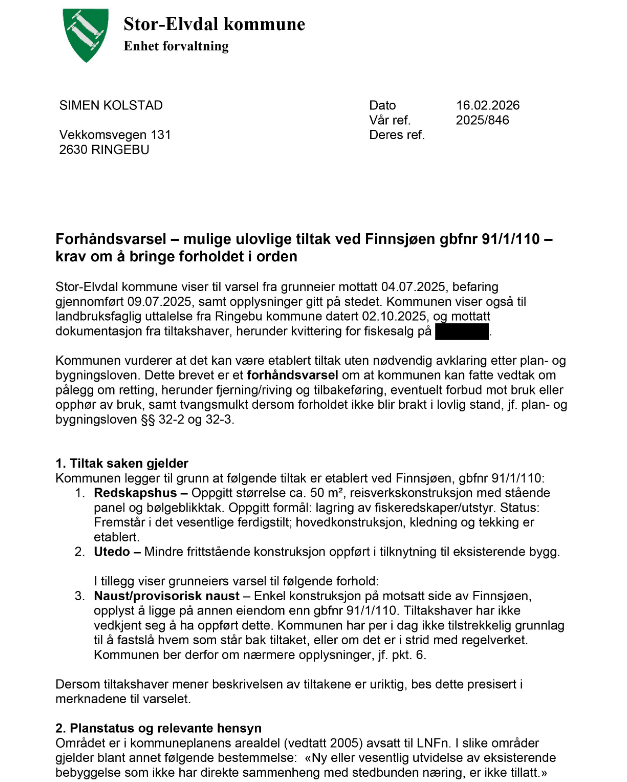 Saken om nybygget til Simen Kolstad på Finnsjøen går sin gang. Nå har Stor-Elvdal kommune gitt Simen Kolstad to alternativer. Han må enten søke om dispensasjon fra regelverket innen 19. mars 2026, eller rive bygget.