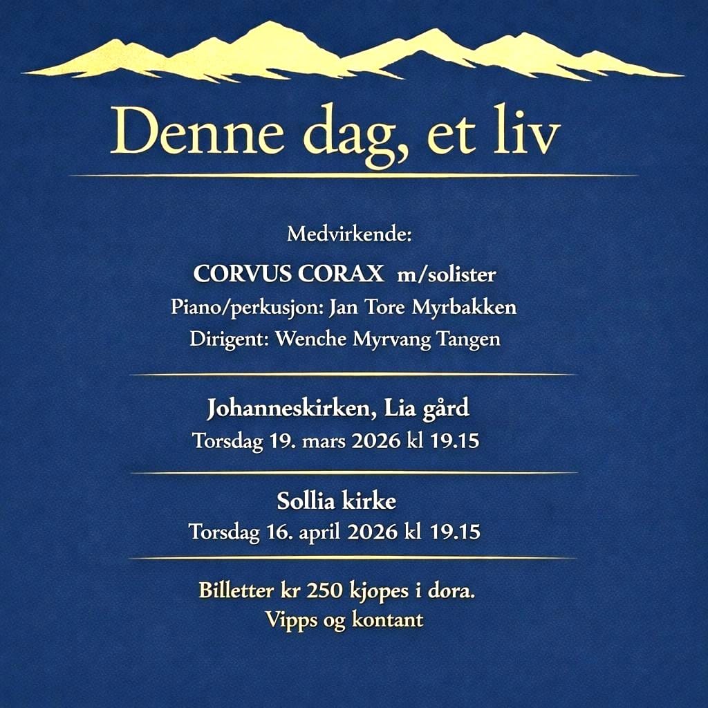 Konserter med Corvus Corax Johanneskirken på Lia Torsdag 19. mars klokka 19.15 i Johanneskirken på Lia gård, Storsjøveien 258, 2485 Rendalen.Torsdag 16. april klokka 19.15 i Sollia kirke.