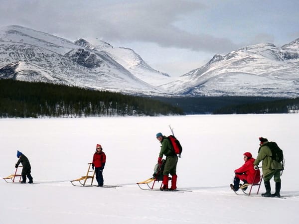 Sparken er et ypperlig framkomstmiddel når bestefar skal fraktes på glatta. Her er tre generasjoner fra Amperhaugen på vei til romjulskonserten i Fossehuset.