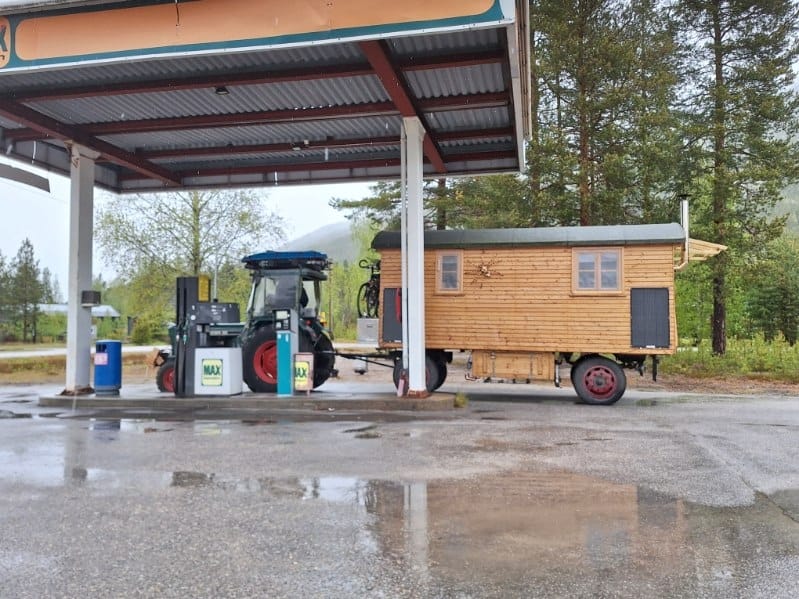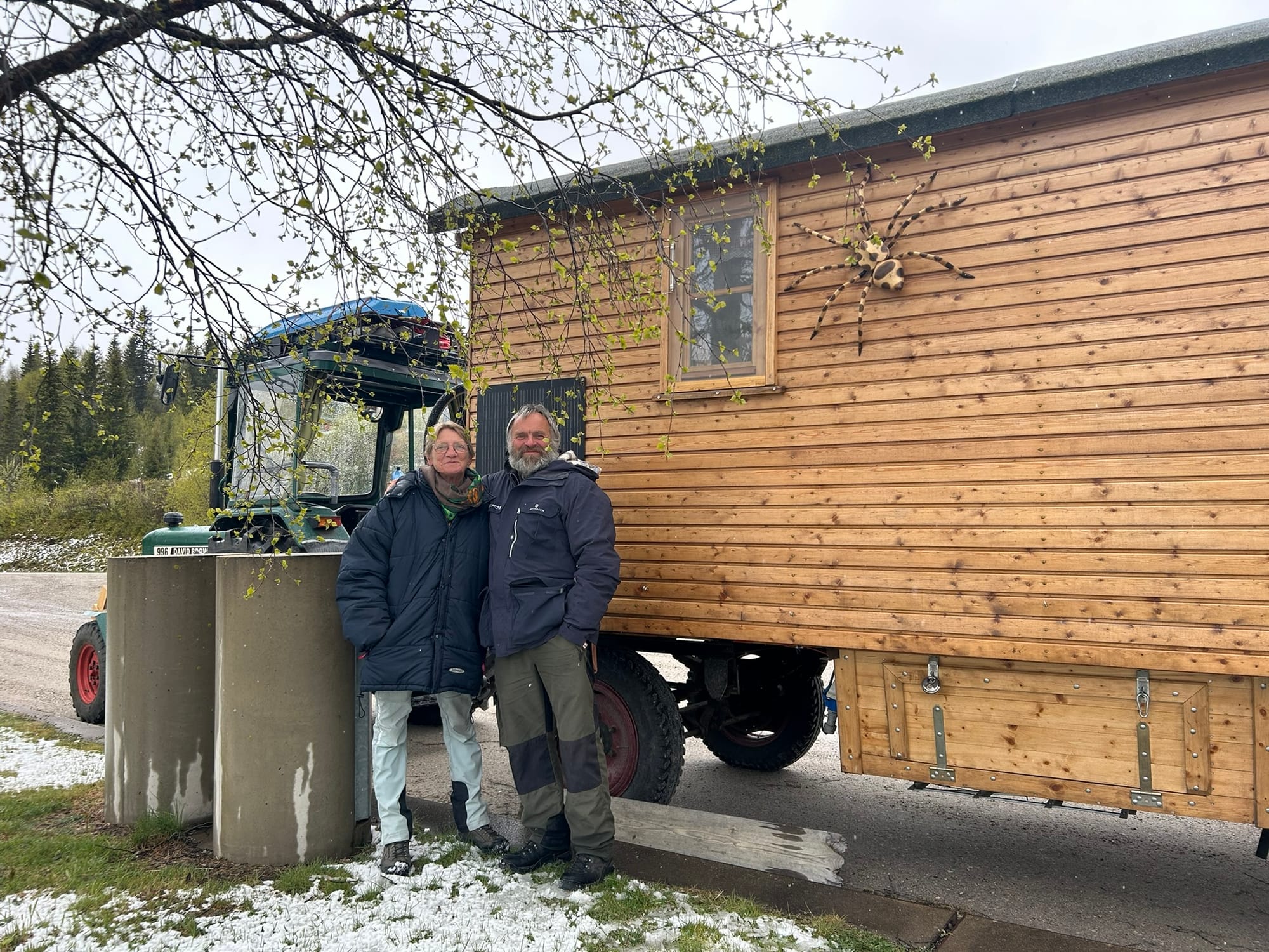 Det finnes mange artige måter å reise på hvis man er litt kreativ. Susanne og Stephan Rasmussen, som kommer fra en liten by utenfor Hamburg i Tyskland har valgt en noe uvanlig metode. En veterantraktor med en flott trebrakke på slep. Med dette reiser de gjennom Skandinavia i sakte fart.