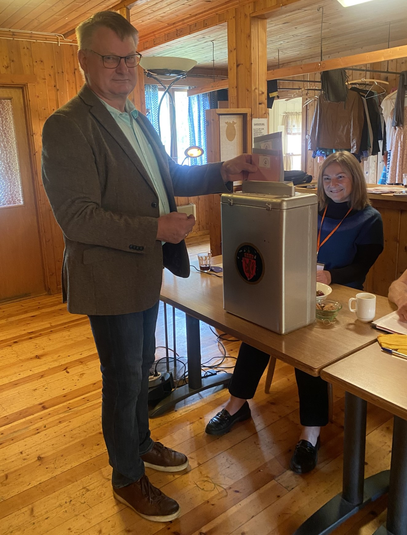 Valgmannskapet som besto av Elise Vaagan-Hovind Nesset, Roy Brænd og Mette Støvneng satt klare fra klokka sju for å passe på at kommune- og fylkestingsvalget gikk riktig for seg. Her har Bente Høyer gjort sin borgerplikt og avgitt sin stemme.