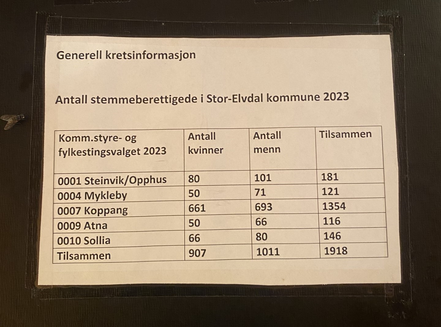 I Sollia valgkrets er det 146 stemmeberettigede. Mange hadde forhåndsstemt, men det var, i følge valgmannskapet, likevel tilløp til kø i valglokalet da fire velgere møtte opp samtidig!