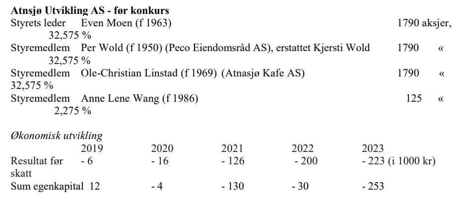 For å gjennomføre visjonene i Reguleringsplanen for Atnasjø kafé ble Atnsjø Utvikling AS etablert i 2019 med Per Wold som daglig leder i selskapet. Wold er også styreleder og daglig leder i familieaksjeselskapet Peco Eiendomsråd AS – aksjonær i Atnsjø Utvikling AS. Grunneier og maskinentreprenør Even Moen, daværende ordfører, har vært styreleder fra etablering til konkurs, og en kort periode før konkursåpning, også daglig leder. Det var etter at tidligere daglig leder, Per Wold, trakk seg, trolig for å unngå å bli utsatt for konkurskarantene
