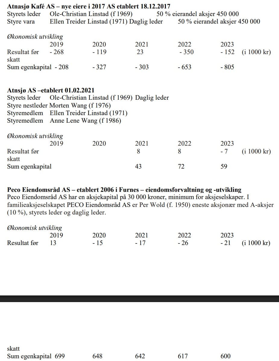 Den økonomiske utviklingen over femårsperioden 2019-23 viser en urovekkende negativ utvikling. Med en profesjonell eiendomsutvikler som daglig leder, er dette en påfallende utvikling – med mindre den er ønsket. Det finnes andre eksempler på prosjekter med utbygging der prosjektet styres mot konkurs for å riste av virksomheten ulike ikke-ønskede bindinger. Konkursboet kan så erverves av sentrale deltakere selv, andre familiepersoner, via stedfortredere eller nære pårørende, for videre drift