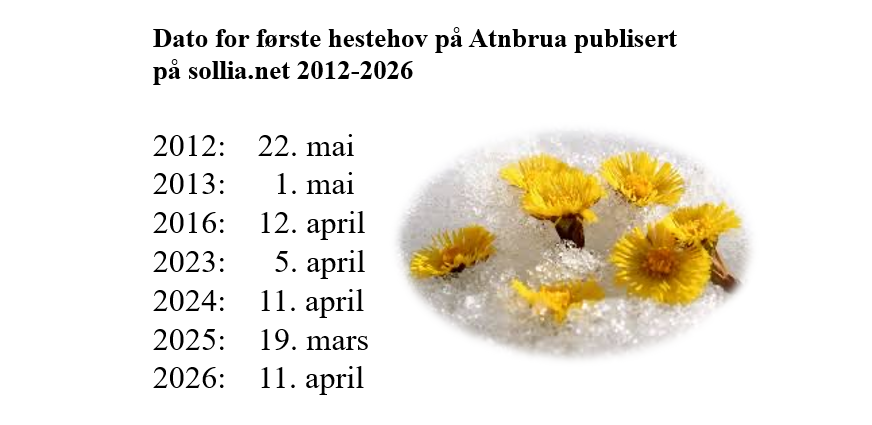 Berit Gomnæs bor 833 meter over havet og er den innbyggeren som bor aller høyest i Sollia, så når det blomstrer i husveggen hennes er det ingen tvil om at våren er i anmarsj. Bildet er tatt 11. april på Atnbrua. Det er ikke uvanlig tidlig, men vi føyer uansett datoen inn på sollia.net sin hestehovstatistikk og håper det snart kommer inn meldinger om flere vårtegn.