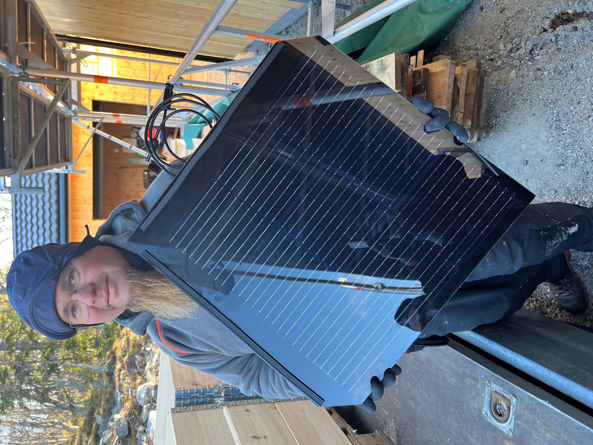 På bildet Jan Stensåsen med et solpanel som nå får plass på taket på hytta øverst i Megrunnslia.