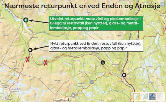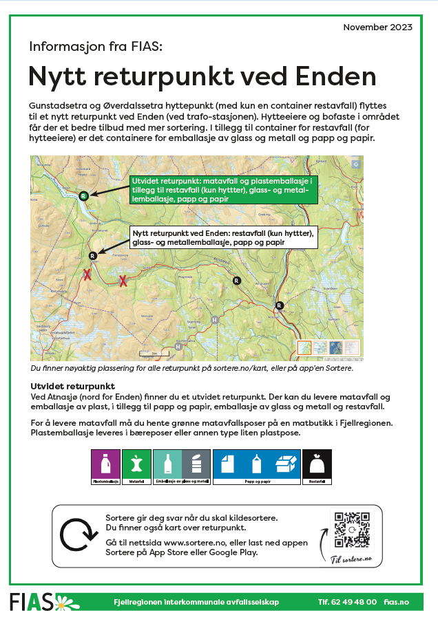 Containerne for hytteavfall ved Øverdalssetra og Gunstadsetra blir flyttet til trafoen litt nord for Enden. I tillegg til restavfall blir det containere for glass og metall og papp/papir på det nye returpunktet.