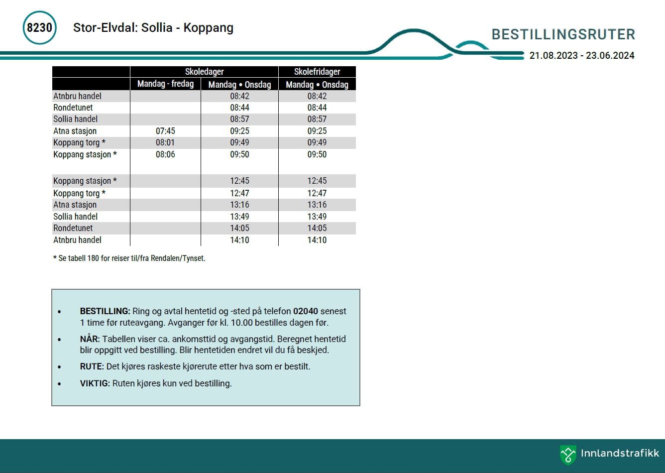 Du finner også informasjon om bestillingsdrosja på sollia.net. Prisene er det ikke noe å si på. Fra Atnbrua til Koppang gjelde prisen for sone 3.