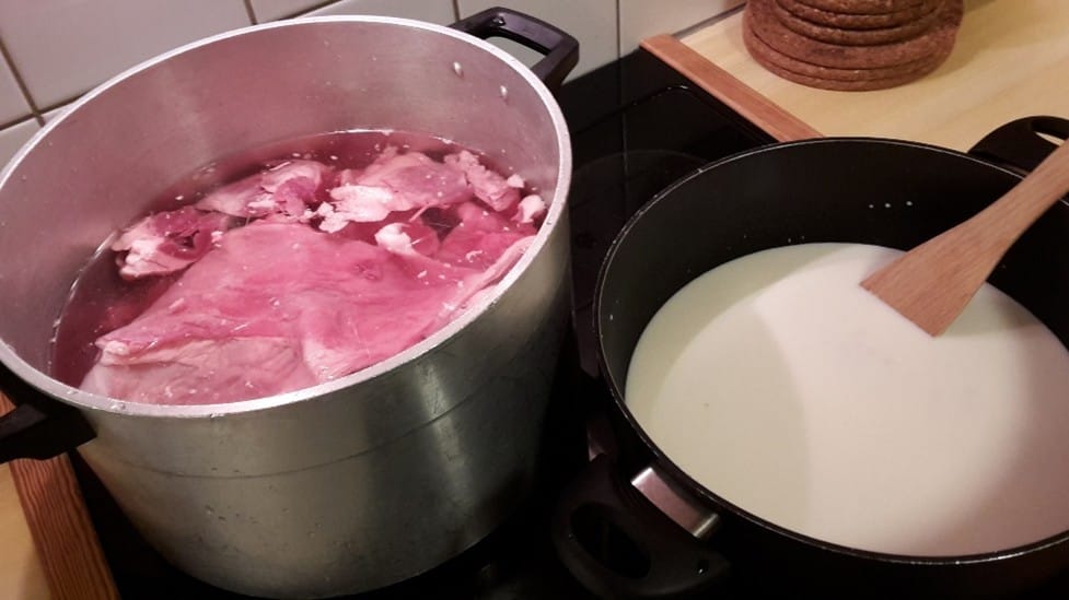 Kjøttet skal trekke i vatn m. salt ca. en halvtime. Imens koker du opp gryna med vatn og lar dem koke en ti minutters tid. Så slår du av vatnet og tilsetter mjølka og 1 ts salt. Nå må det koke til gryna er møre, og da går det fort tre kvarter. Den som, i motsetning til meg, husker å legge i bløt gryna kvelden før, slipper lettere fra det.
