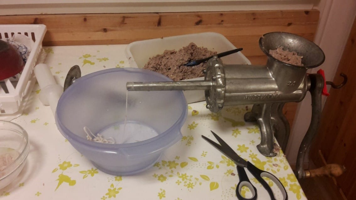 For å få deigen over i tarmer, er det praktisk med en gammel, god sveivekvern med pølsestrut. La pølsene være 20-25 cm lange, og knyt for tarmen med bomullsgarn. Tarmen krymper når pølsene trekkes, så det må minst være 2 cm tom tarm innafor knuten og 1 cm utafor.