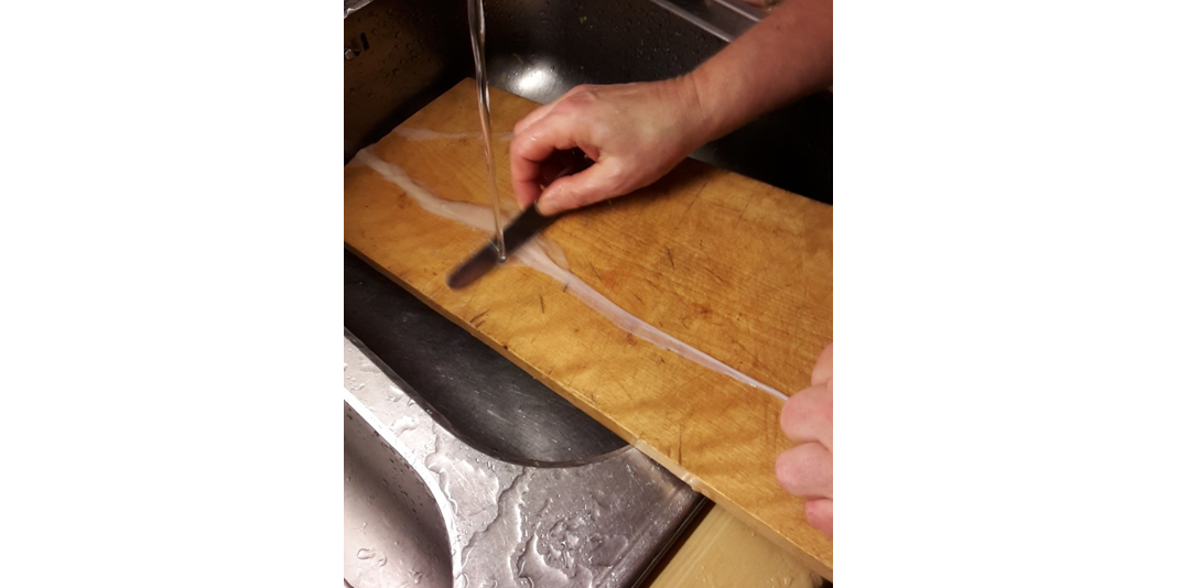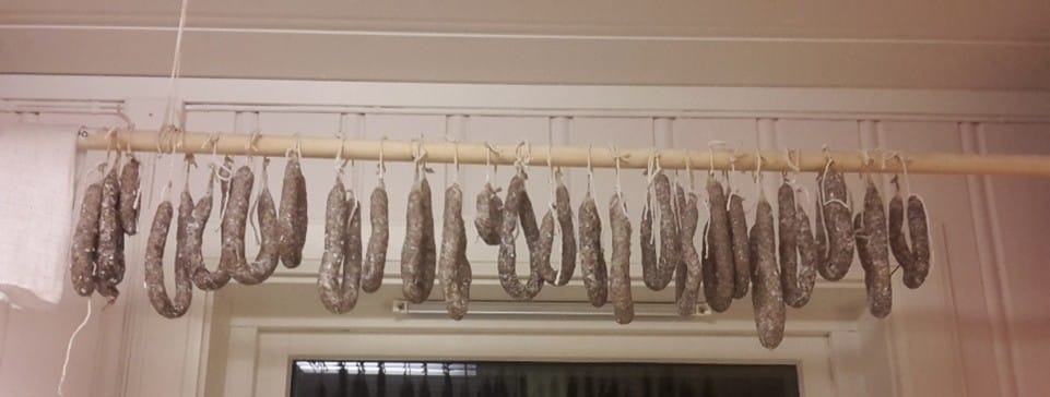 Pølsene skal trekke i 5-10 min, gjerne i den silte krafta fra kjøttet. Vannet må ikke koke, da sprekker de. Det hjelper også å prikke dem med ei stoppenål før trekking. De må snus, slik at hele tarmen blir varmebehandlet. Etter at de har rent godt av, skal de henges opp, for eksempel på et kosteskaft, og de skal henge etter hyssingen. De er veldig skjøre og brekker lett, så vær forsiktig. Nå kommer det som mattilsynet ikke er så glad for: De skal henge i romtemperatur ei ukes tid, til de er gode og sure. De vil også tørke ganske mye på ei uke, og hvis de oppbevares kjølig, kan de holde seg i månedsvis.