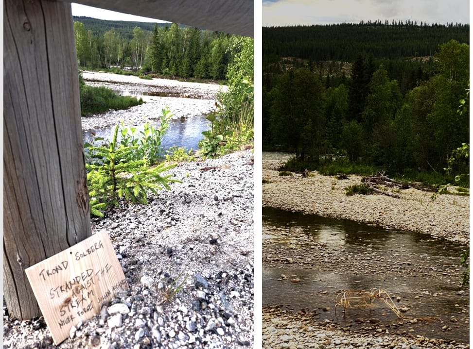 Trond har plassert "Stranded against the stream/Never forget Julian Assange" ute i elva, så det skal bli spennende å se hvor lenge den blir stående før strømmen tar den.