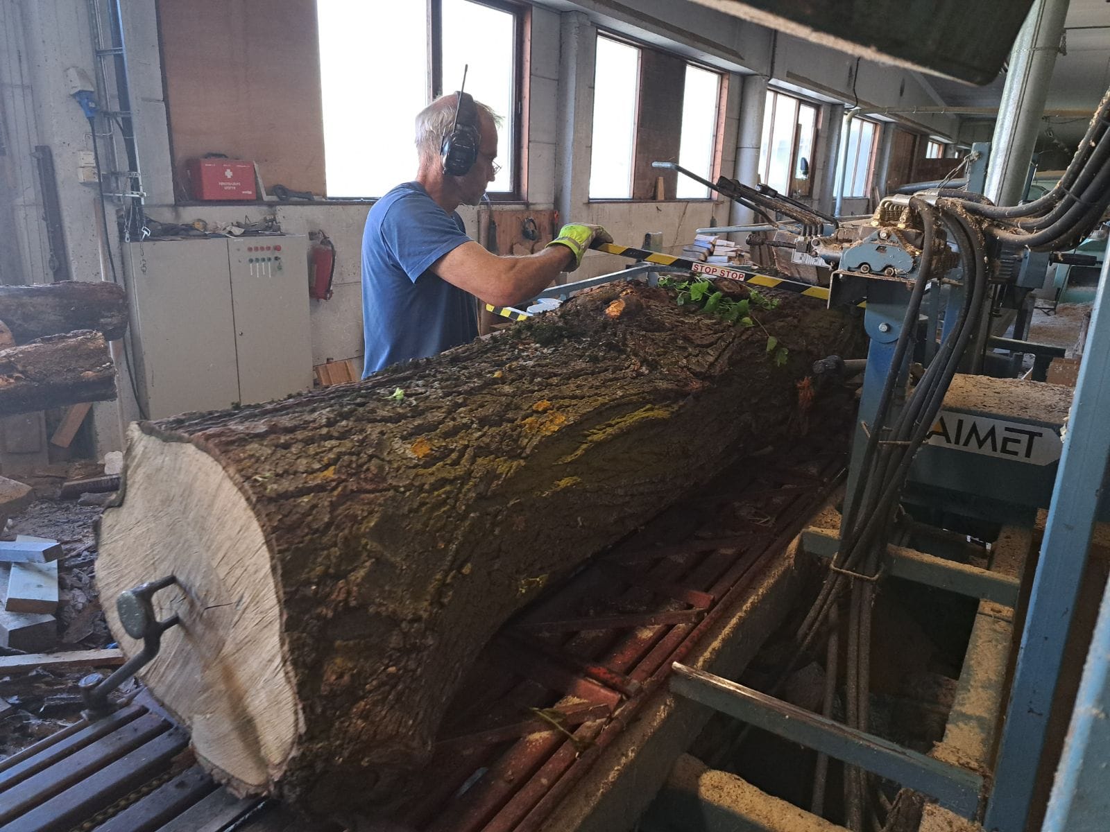 Lind vokser det ikke her hos oss, så råmaterialet er hentet i Stange hos Anne-Marte Hoelstad Mauset og Lars Magne Mauset på Hemstad Østre. Tor Einar Skogesal ses i gang med å bearbeide lindestokken.