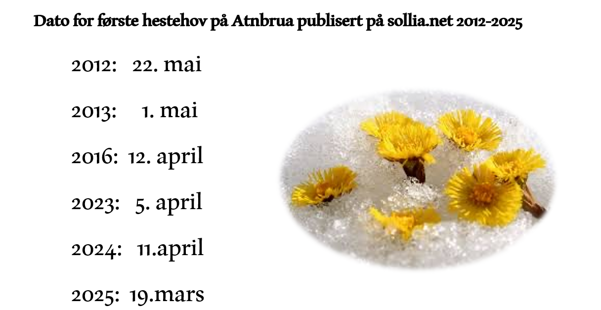 Den første hestehoven dukket opp hos Berit Gomnæs allerede 19. mars. Berit har sendt inn vårtegn fra Atnbrua i mange år. Vi har lett i arkivet og funnet ut at dette er den tidligste hestehoven vi har bilde av - så langt.